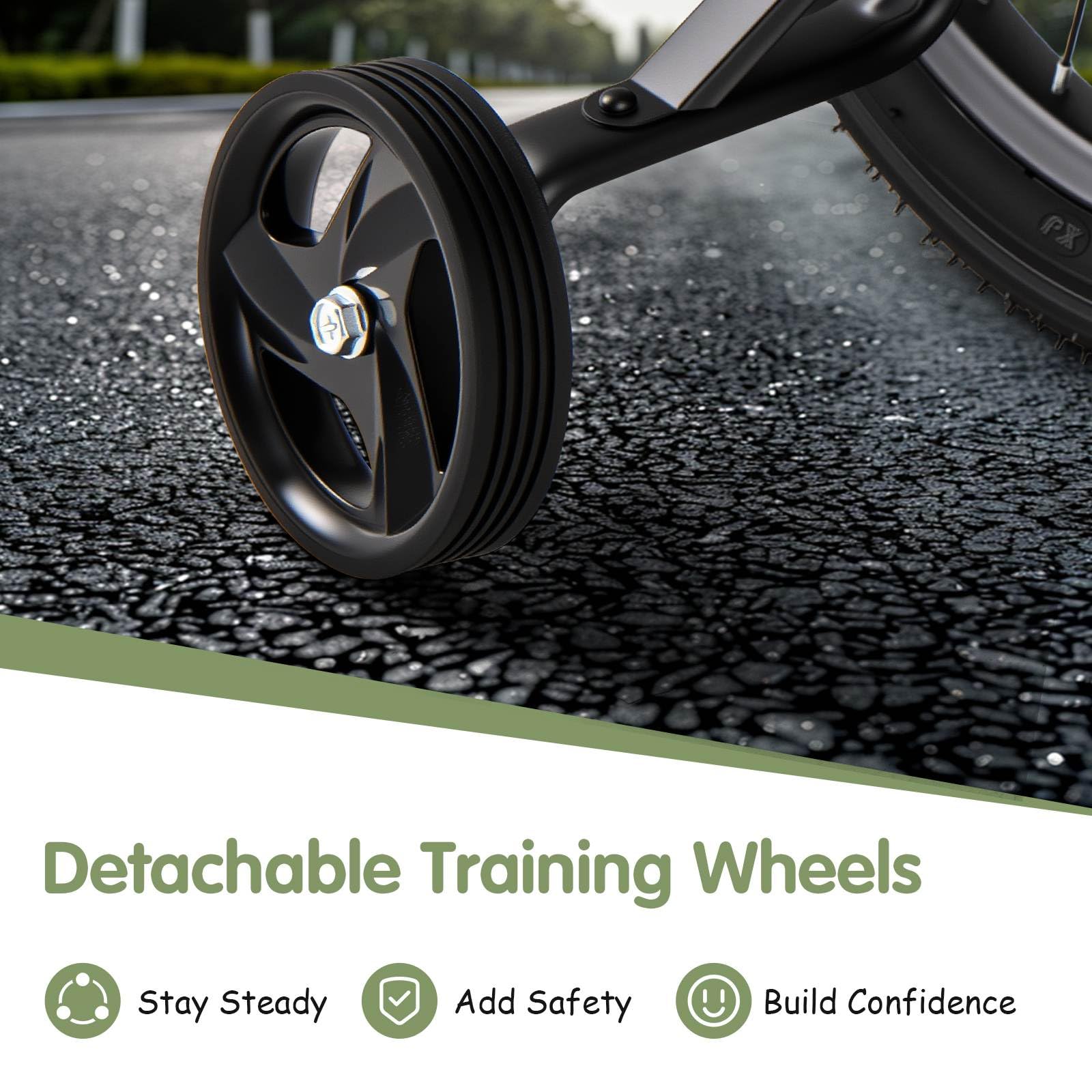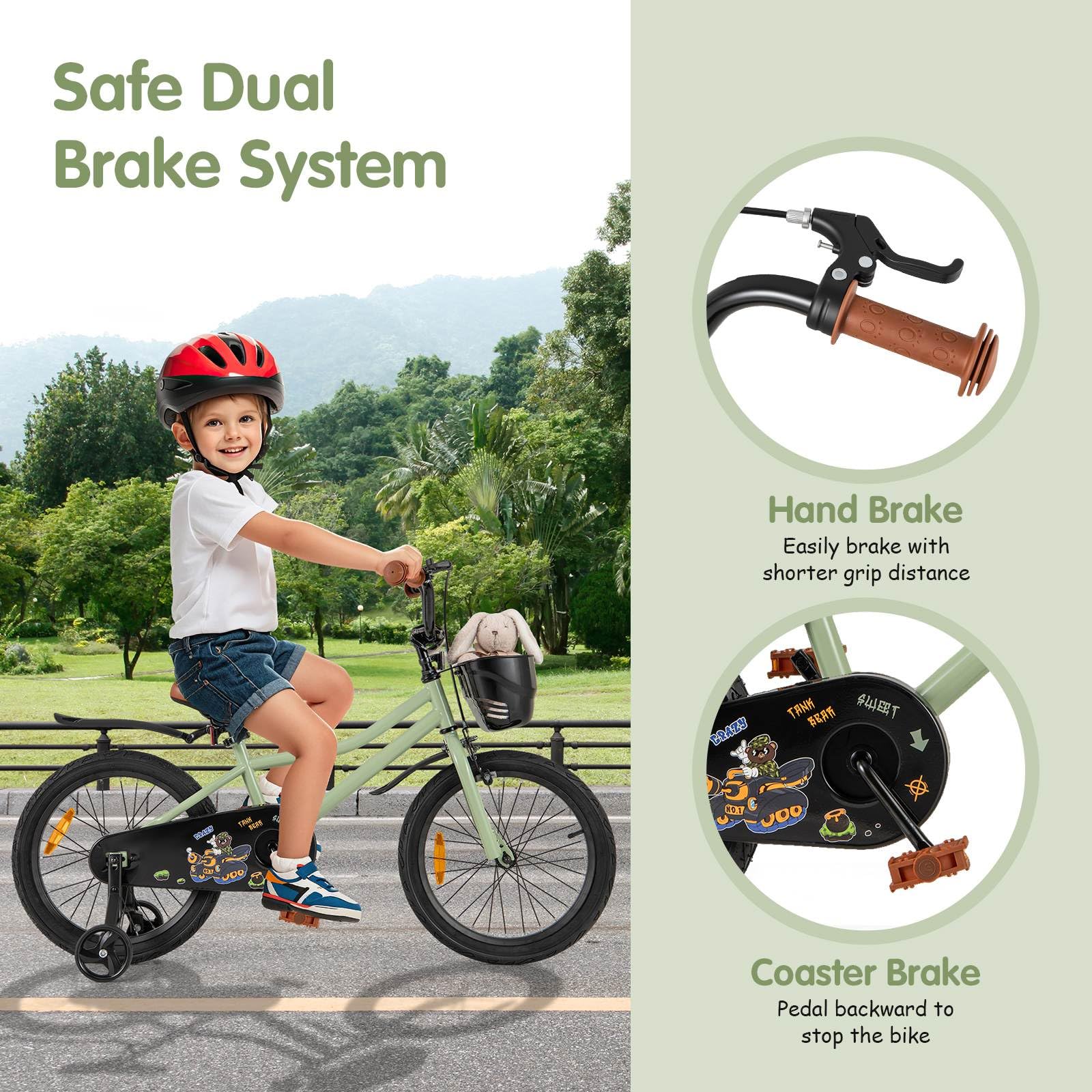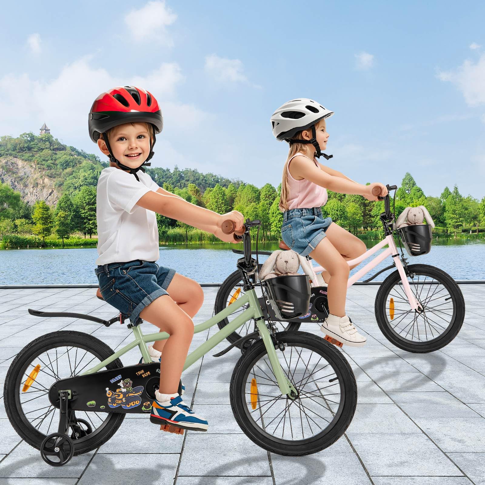 The front basket enables kids to store their favorite toys. The handbrake and rear coaster brake ensure safe stop. Plus, 2 training wheels and anti-slip tires are included to provide the necessary support for beginners. With an adjustable saddle and handlebar, the bike will grow with your child, fitting 3-5/4-7/4-8 years old children. 3 wheel size options are available. The bike bell brings kids more fun. Additionally, the kids bicycle is safe to ride with front & back reflectors, anti-slip grip, fully enclosed chain guard, and non-slip pedals.