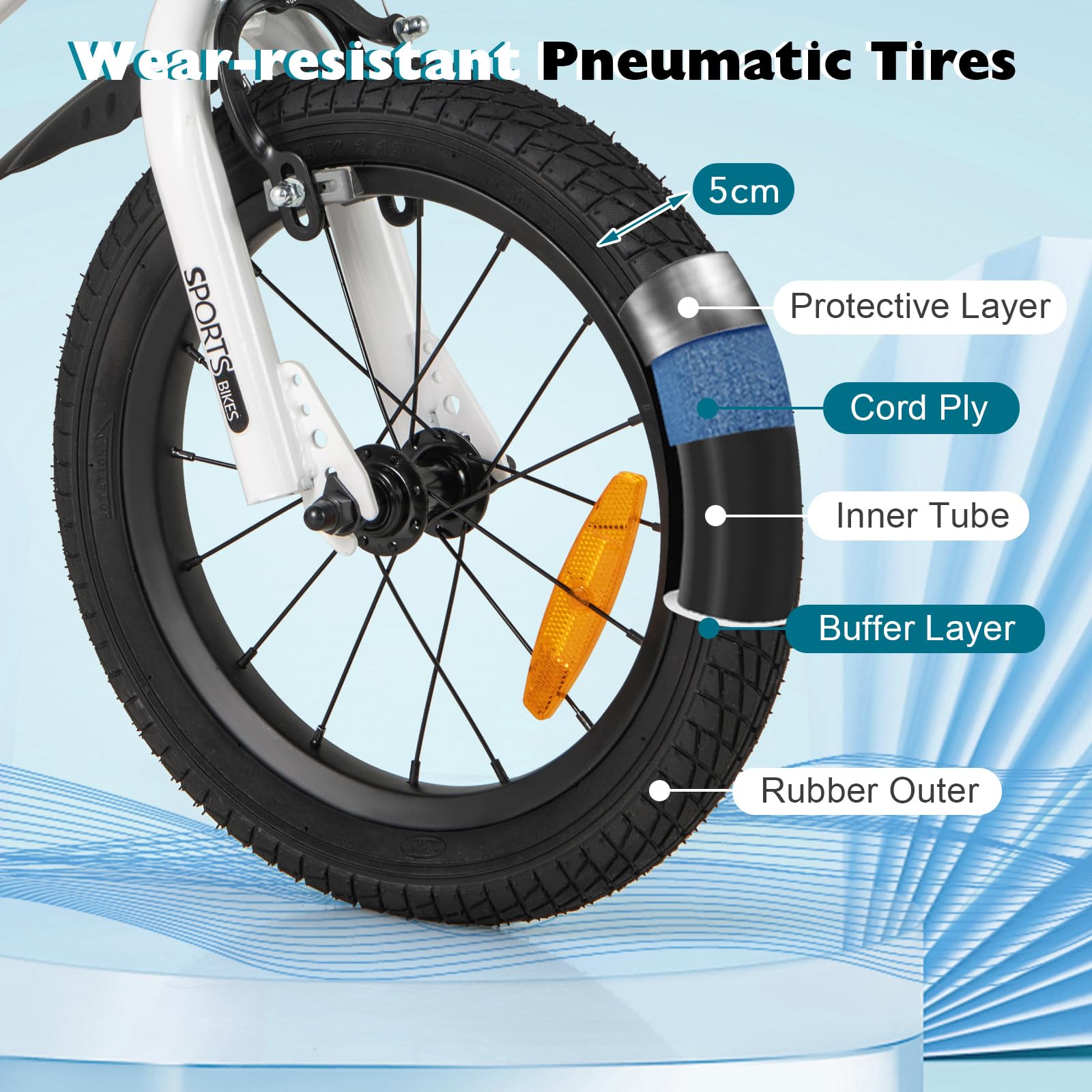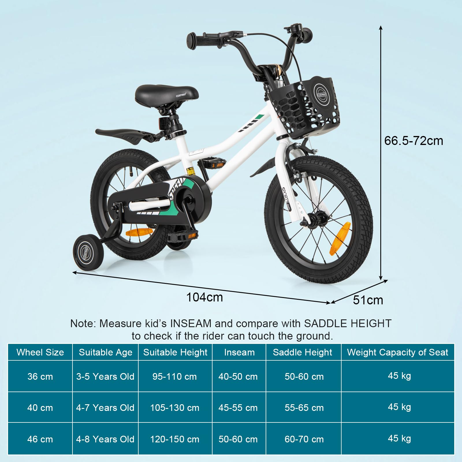 Our kids bicycle with detachable training wheels is the perfect present for children 3-7 years old. And we recommend measuring the height and inseam of your kids before purchase. Safety is paramount with a hand brake and a coaster brake, ensuring reliable stopping. Besides, the frame is constructed of high-strength carbon steel, which is built to withstand the rigors of daily use. And the sturdy pneumatic tires provide excellent traction and navigate any terrain effortlessly. Our bicycle offers not just joy but also the essential safety features required for a memorable outdoor experience.