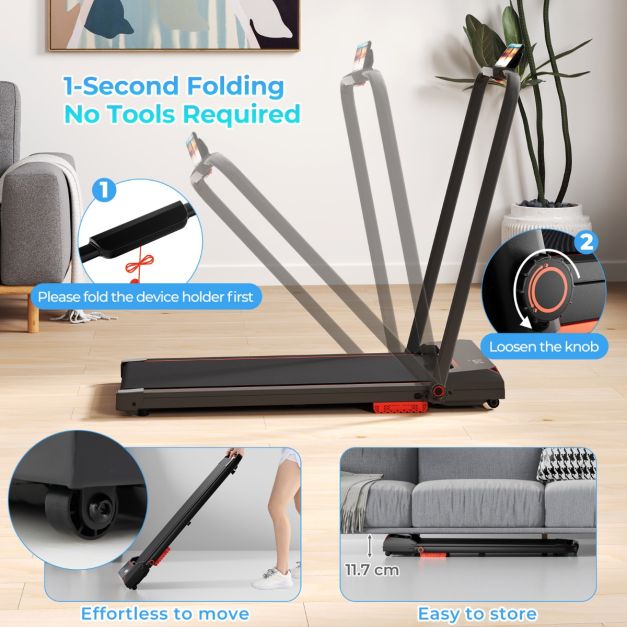 Compact and and Portable Design: This slim 11.7 cm treadmill optimizes space with its foldable structure. For storage, you just need to fold the device holder, and then loosen the knob to fold the handle. The smooth-rolling built-in wheels also make the treadmill easy to move.