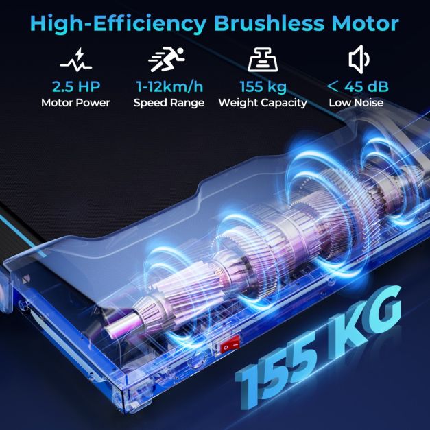 Efficient 2.5HP Motor: This treadmill is powered by a strong 2.5HP motor capable of supporting up to 155 kg, and operates quietly below 45 dB, which is perfect for home or office use without disturbing others.