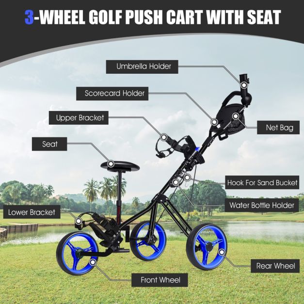 Supported by a steel frame, it features a strong load capacity and can accommodate your heavy golf bag which should be fixed with straps. Also, the handle is 4-level adjustable, meeting the different needs of people of different heights. During the golf competition, you can easily stop the cart with breakable wheels, place an umbrella in the holder and enjoy the coolness. If you get tired, you can sit on the padded seat. Plus, there is a cup holder for you to hydrate in time and a scoreboard to record scores. What’s more, this 3-wheel golf cart is foldable, making storage and transportation much easier. Finally, the assembly is a piece of cake.