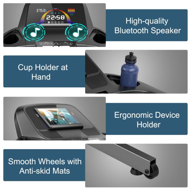 Full-Featured Control Panel: The LED display clearly shows speed, time, calories, distance, heart rate and steps, and offers fast adjustment by pressing keys. Two Bluetooth speakers and the electronic device holder provide you with an enjoyable exercise environment while two heart rate sensors allow for monitoring your exercise intensity.