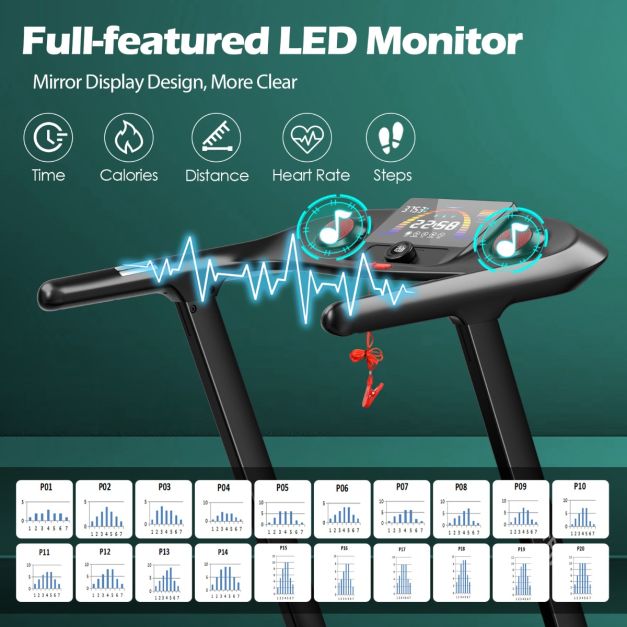 20 Preset Programs & Customizable Settings: This running machine features 20 preset programs to meet your various workout needs. Also, you are able to set your desired goals for exercising, such as time, speed, distance and calories consumption. Moreover, the machine is equipped with dual Bluetooth speakers and the device holder for convenient entertainment during exercising.