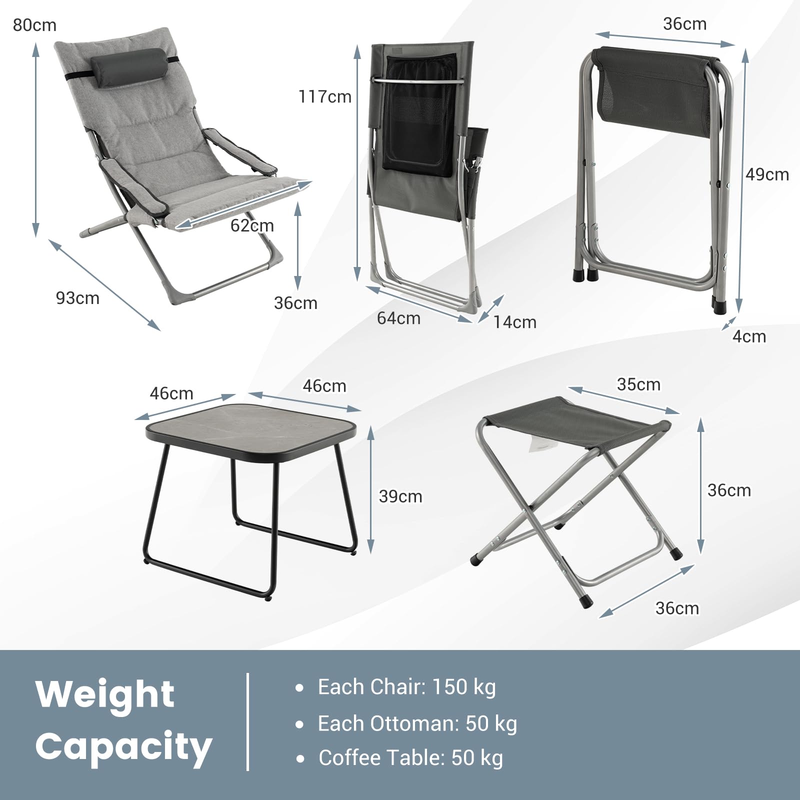 Folding Chairs & Ottomans: Both the chairs and ottomans are foldable for space-saving storage and effortless carrying. And the folded ottoman can be stored into the pocket of chair. The folding design allows you put the 4 pieces in the car trunk or in the corner of your room.