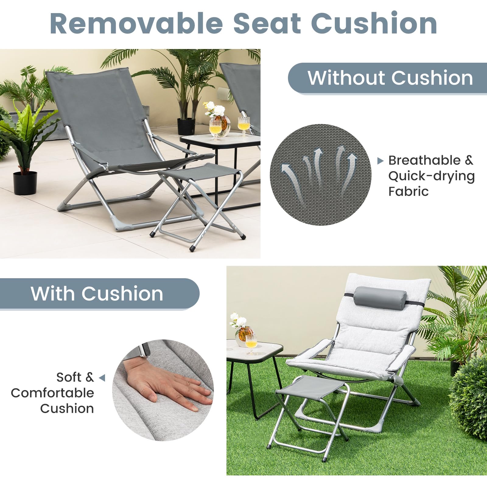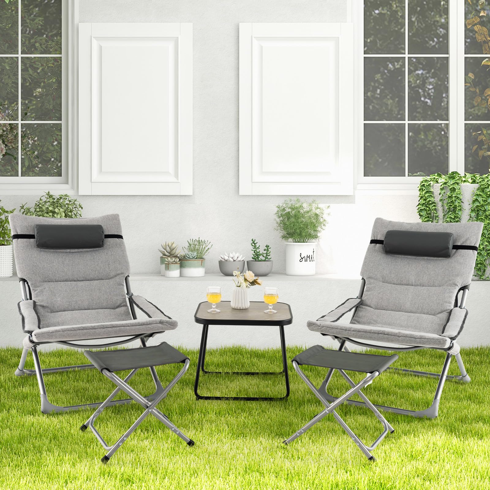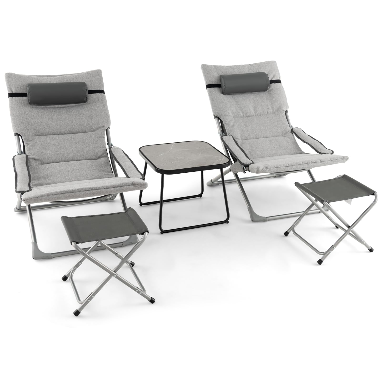 Transform your outdoor space into a cozy and comfortable area with this 5 piece patio sling chair set. Perfect for balconies, backyards, gardens or even the beach, this all-inclusive set is everything you need for ultimate relaxation. Featuring two folding sling chairs complete with ottomans and a matching coffee table, this set will make you and your friend fully relaxed. The removable seat cushion and headrest combo provides an extra layer of comfort. What's more, with heavy-duty metal frame, the 5 pieces can withstand strong load. And the folding and portable design allows you to easily store or transport the patio set. Elevate your outdoor lounging experience with this sling chair set!