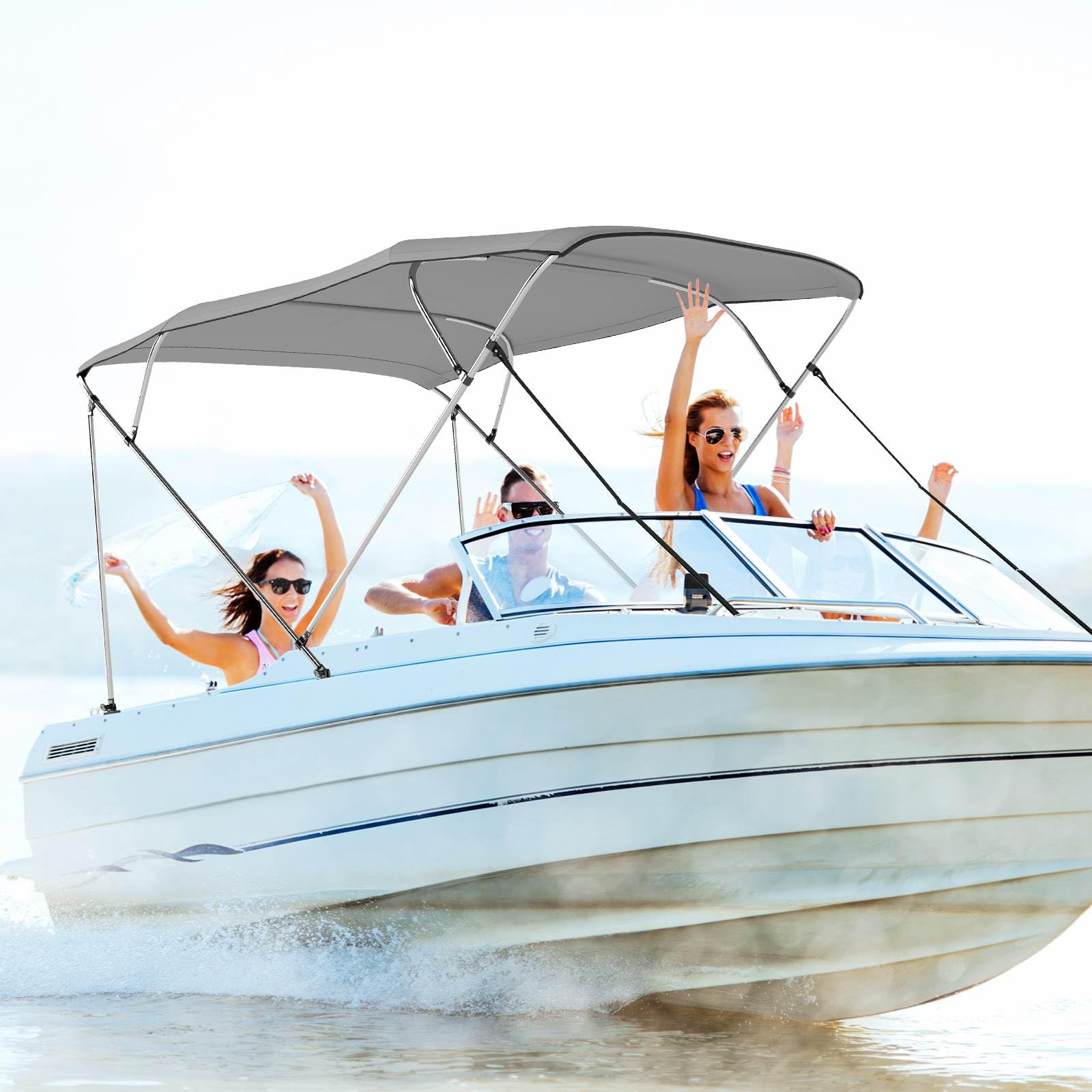- The adjustable straps feature hooks to securely attach the canopy to the boat