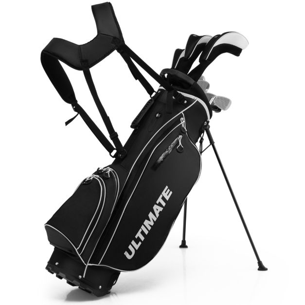 This complete golf club bag set contains 9 pieces of most commonly used clubs, 3 matching head covers and a portable stand bag for all golf lovers to experience the ultimate golfing time. The 9cs kit includes an aluminum driver, a 3# fairway wood, a 4# hybrid, 6#/7#/8#/9# irons, a pitching wedge and a putter, which help your practice all skills and achieve the final goal. And to improve hitting accuracy, the driver is integrated with a 460cc oversized clubhead while the heel/toe weighted putter combines an alignment aid. What's more, the clubs are all made of high-quality material for a long service life. When they are not in use, you can properly keep them in the matching stand bag with a 7-way divider. By the way, the stand bag can be easily carried thanks to the built-in handle and adjustable shoulder straps. It also features multiple pockets for functional storage.