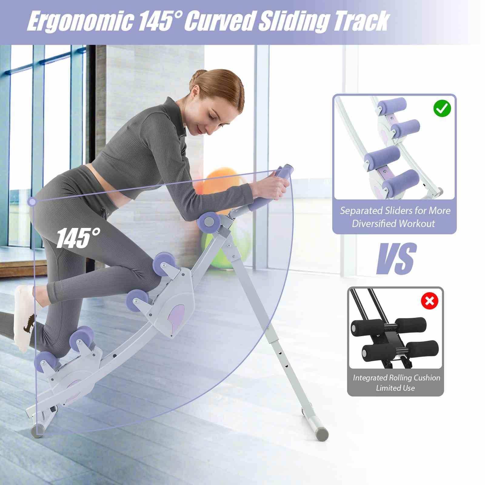 This Ab trainer with curved track and separated sliders design provides multiple exercises for full body workout, like slide AB crunch, oblique AB crunch, single-leg sliding, leg raise, arm & hip exercise. It is perfect to slim your arms, back, waist, kegs as well as hip lift. What's more, there are 4 adjustable resistance levels for you to choose from. Equipped with an LCD monitor, soft foam covered rollers, anti-slip handrails and non-slip foot pads, this Ab machine can give you a scientific, comfortable and safe workout experience. In addition, the abdominal fitness machine can be folded up easily when not in use, which is easy to store and save space.
