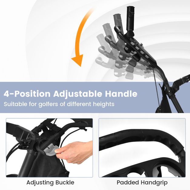 4-Position Adjustable Handle: This 4-wheel golf trolley features an ergonomic padded handgrip for comfortable pushing and pulling. It is designed with 4 adjustable pushing positions, which makes this golf trolley suitable for golfers of different heights.