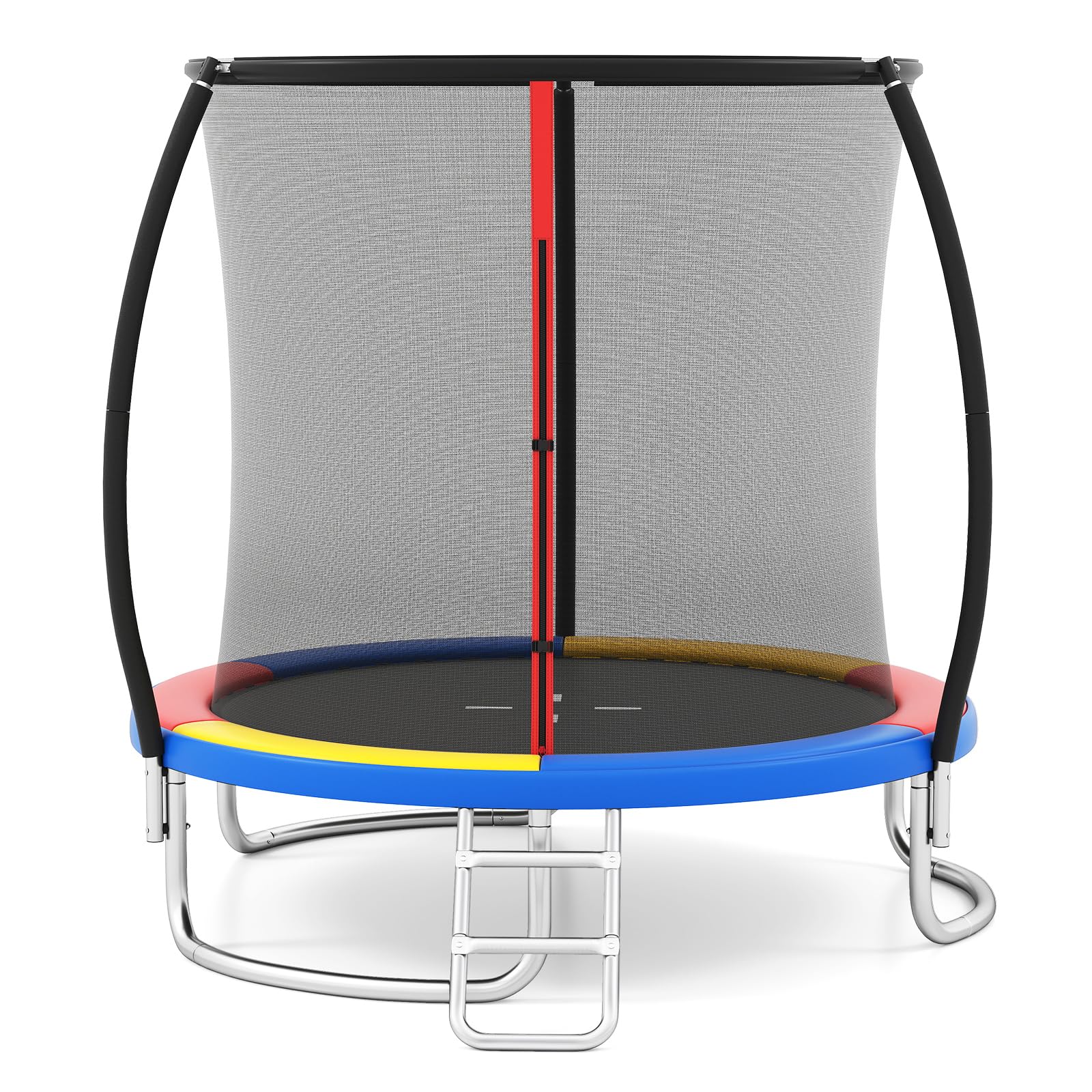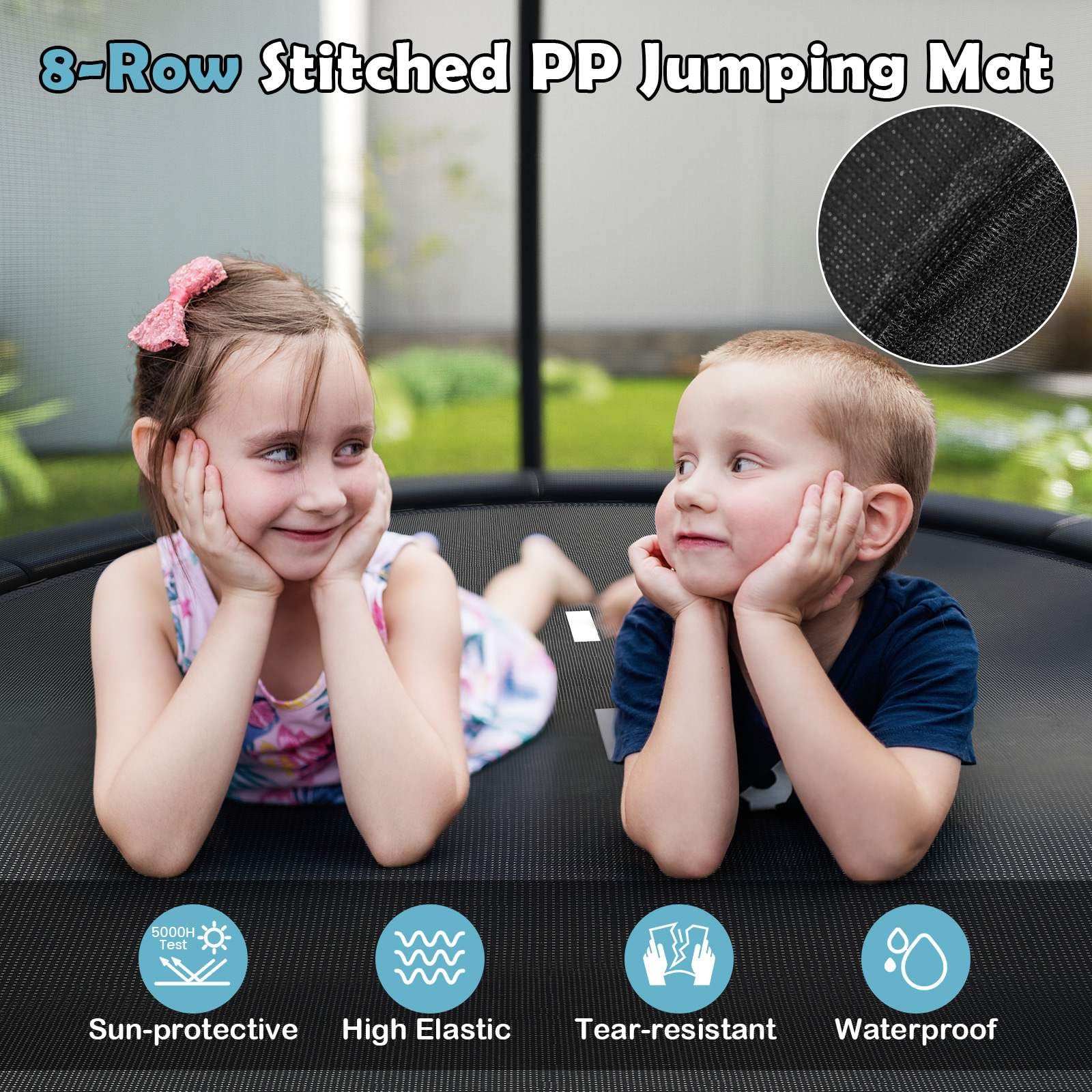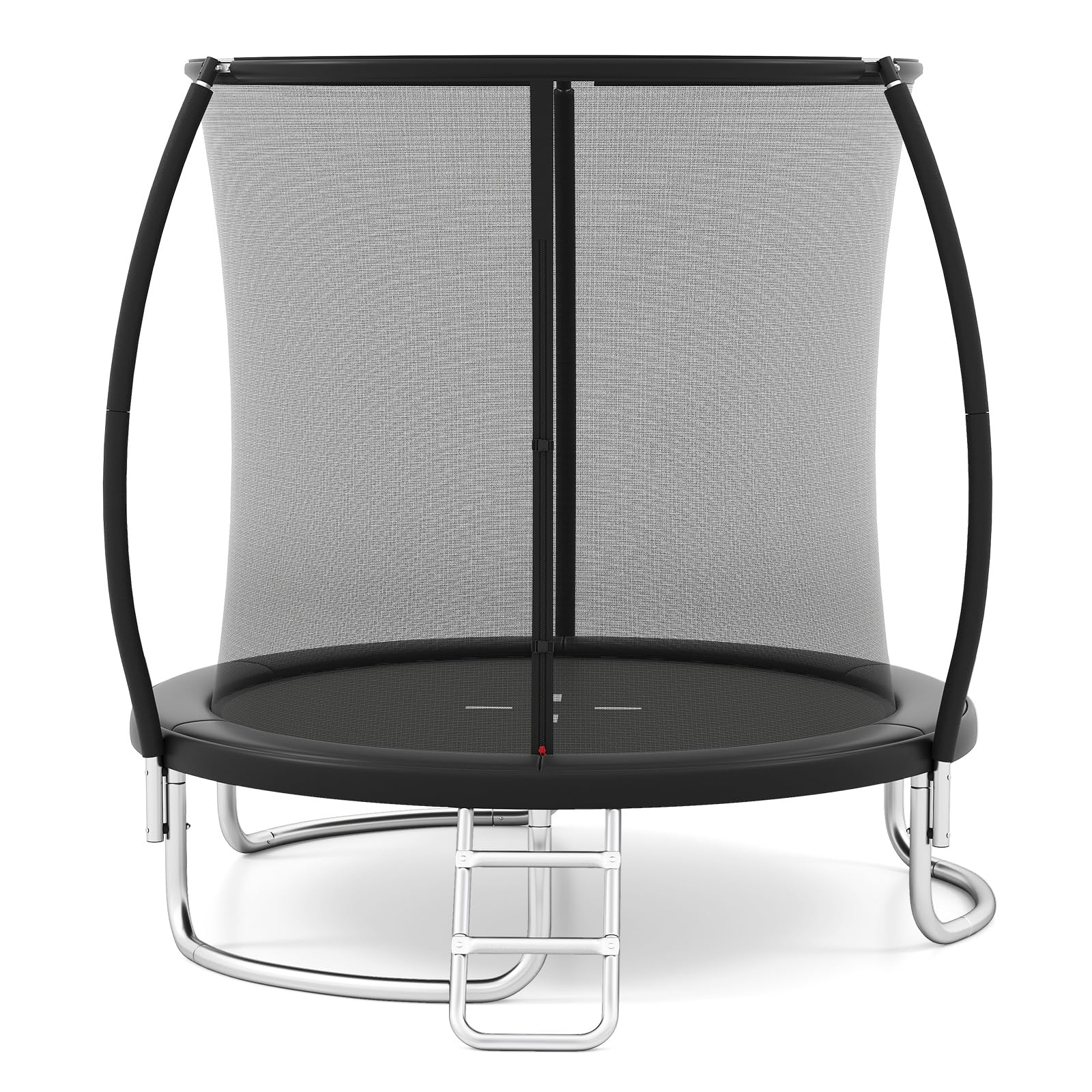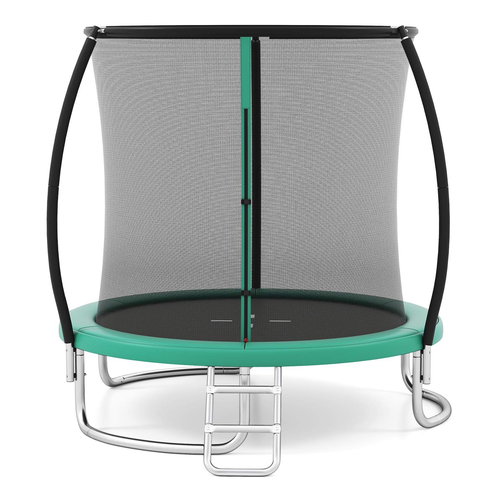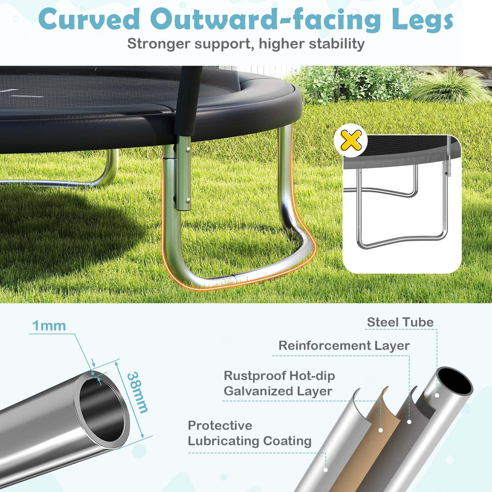 The safety design includes curved poles and a no-gap net attachment for injury prevention. The curved leg tubes enhance stability, while the heavy-duty springs and rust-resistant galvanized steel frame ensure lasting quality. You will enjoy a high bounce on the anti-slip jumping mat with tear-resistant enclosure net. The ladder provides easy access, and the padded spring cover adds comfort and safety to your jumping experience.