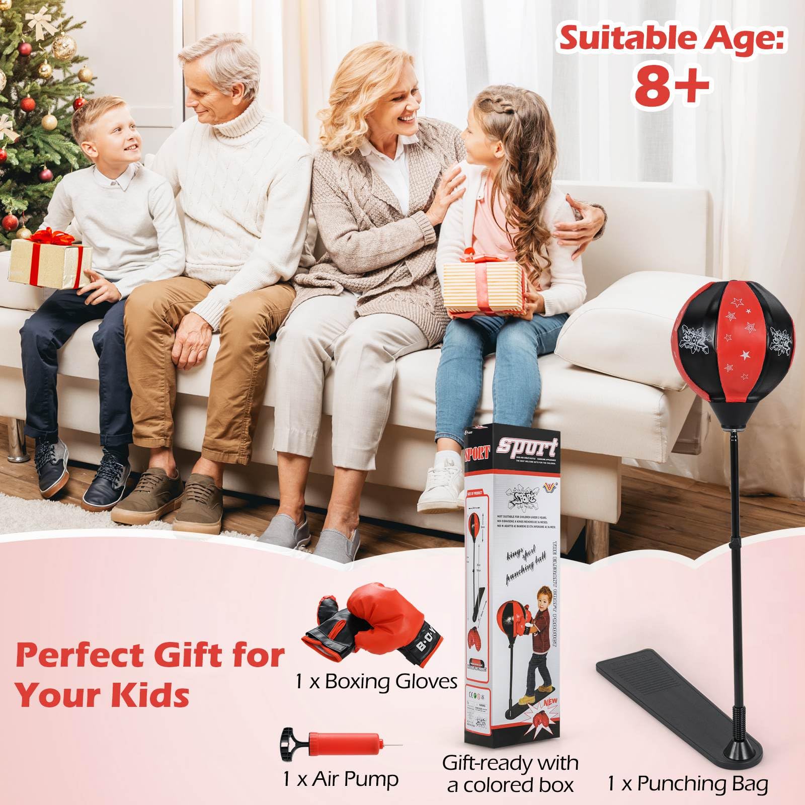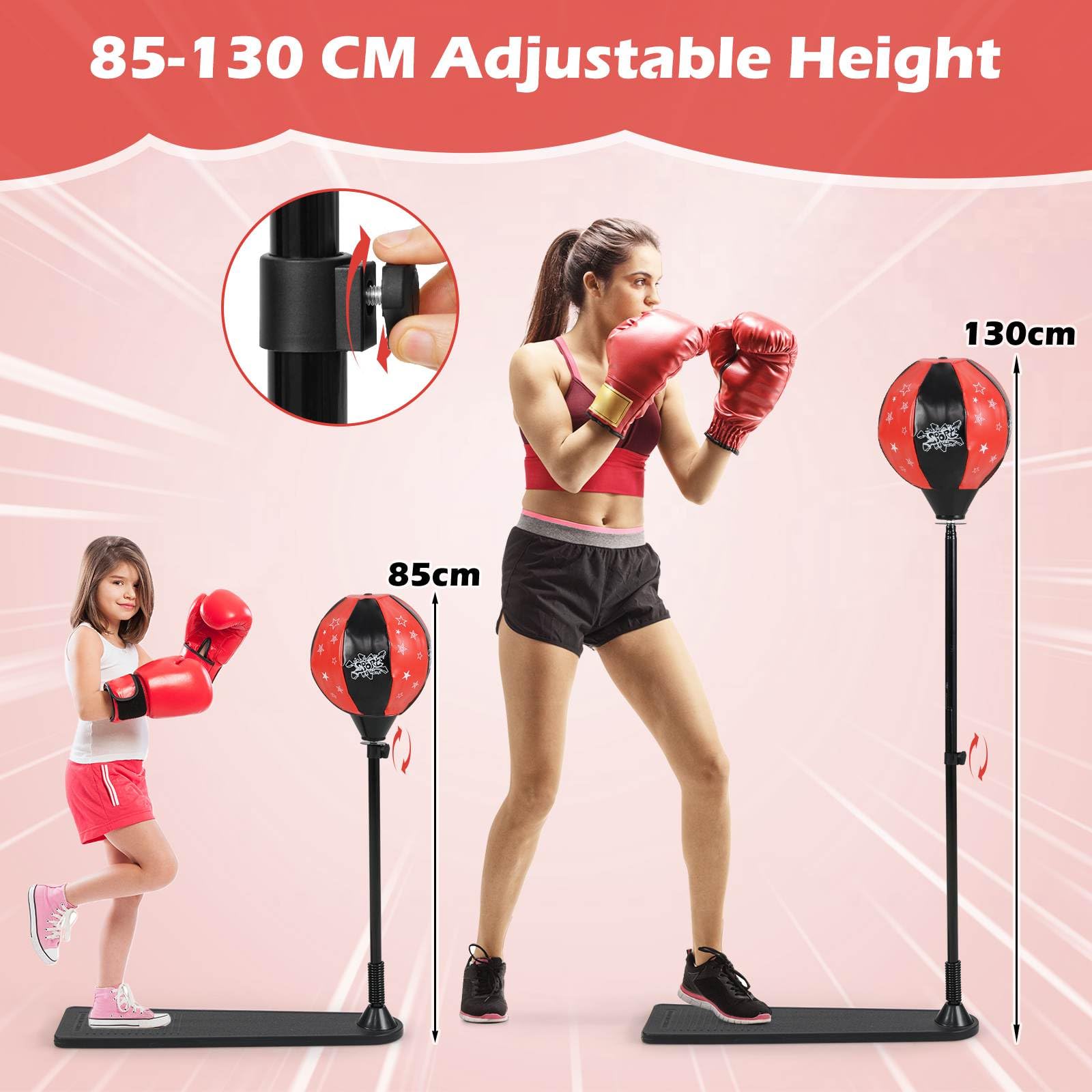 Our standing punching bag can develop kids' social skills and hand-eye coordination ability. This kids boxing punch stand set allows children to enjoy happiness and confidence in the process of punching. The cute and stylish look of our punching bag will instantly capture your kid's attention and arouse their interest, so it is great for enlightenment. The height can adjust between 85cm to 130cm to meet different requirements of children at different ages. And the freestanding design is more convenient to use. Our freestanding punching speed bag is the perfect gift for your children!