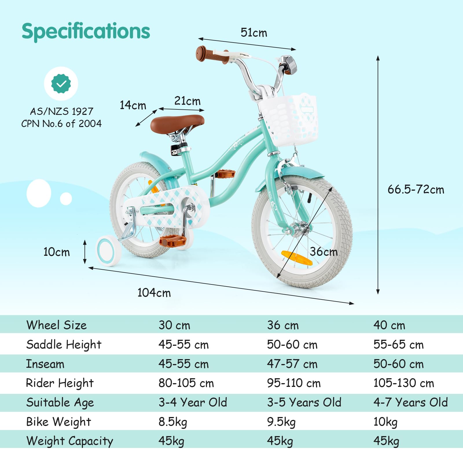 Our cute 36 cm children's bike will let your little one enjoy riding. Designed with adjustable handlebar and seat height, it's suitable for 3-5 years old kids or toddlers with 95-110cm height. Note: Measure kid's INSEAM and compare with SADDLE HEIGHT to check if the rider can touch the ground. Meanwhile, 2 anti-slip and shock-absorbing wheels can move safely and smoothly on flat surfaces. Kids won't feel uncomfortable when sitting on the smooth seat even after long-term riding. Besides, if kids want to stop the bicycle, there is a hand brake and a coaster brake for them to choose. Plus, it has passed AS/NZS 1927 and CPN No.6 of 2004.