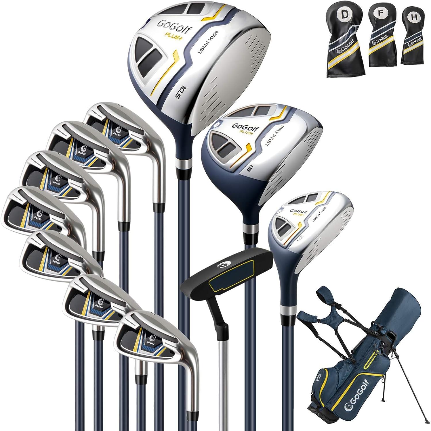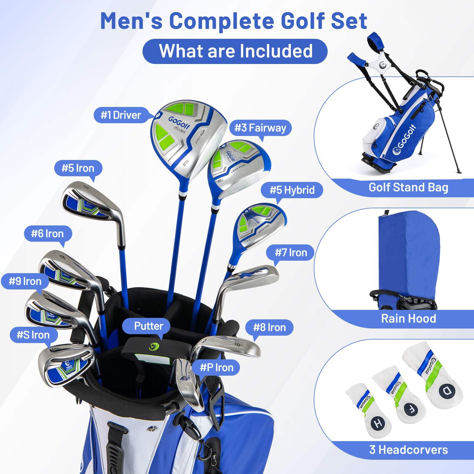 Elevate your golf game with this men's complete golf set, including a driver, fairway wood, hybrid, irons, and putter neatly stored in a stylish stand bag.