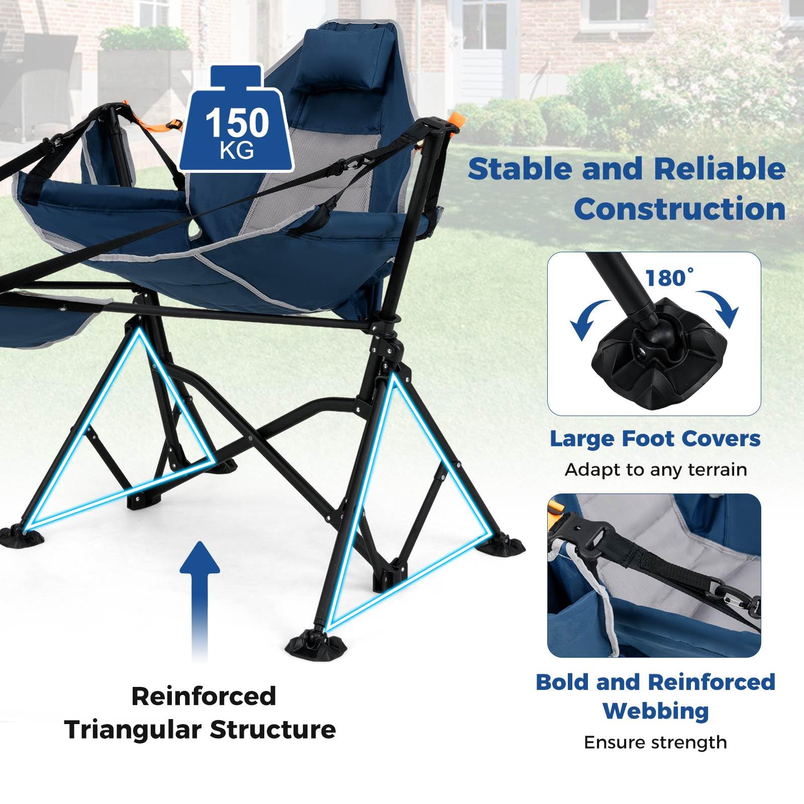 Our oversized hammock camping chair with an expansive width of 95 cm, redefines outdoor comfort, designed to provide a spacious and enveloping sitting experience. The adjustable backrest can be tilted between 90 and 150 degrees, allowing you to find the ideal angle for relaxation, supported further by the ease of adjustment through handy side straps, coupled with padded seats, armrests, a removable footrest and headrest for enhanced comfort. More than that, this chair is supported by a stable triangular metal frame and boasts a reliable oxford cloth seat, ensuring both stability and durability in any outdoor scenario. Stability is further ensured by large foot covers that adeptly adjust to any terrain. Designed for immediate use, the chair sets up in seconds, unfolds easily and comes with a portable carrying bag for storage and transportation. Whether you are relaxing in the yard or enjoying outdoor adventures, this hammock camping chair combines functionality and comfort for all your outdoor leisure activities.