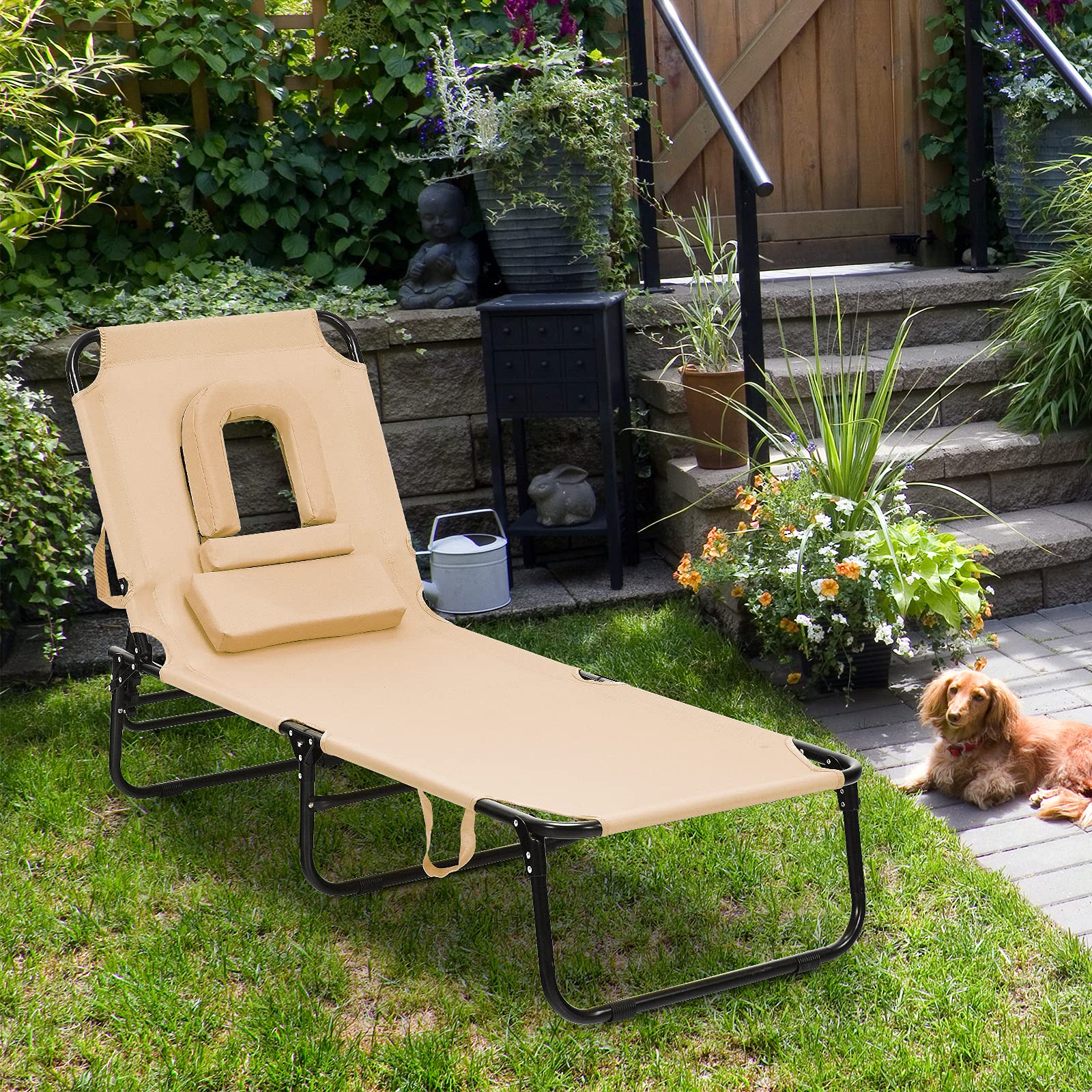 Face Hole and 3 Removable Pillows: The chaise lounge comes with a wide facing hole, so you can fully enjoy the sunshine while reading a book or chatting on the phone. Plus, the tanning chair has 3 pillows that can be taken off for free combinations. Also, they're considerately padded to offer a comfy touch.